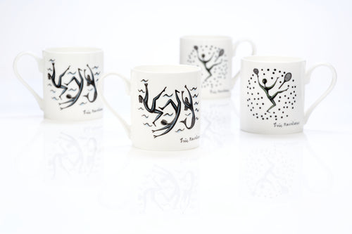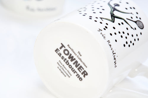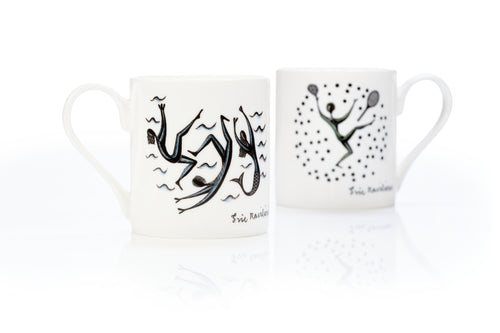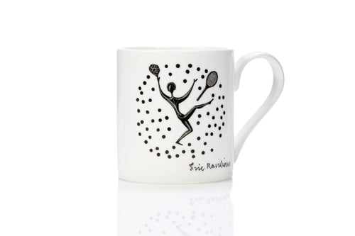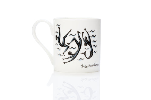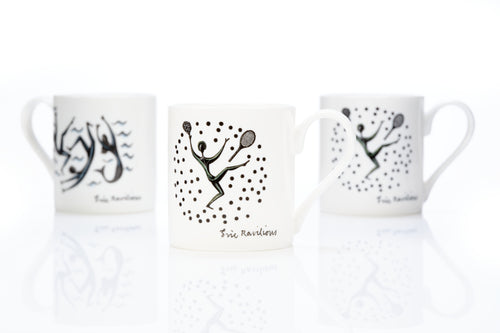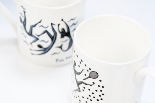 Bone china mug, featuring two sports themed designs by Eric Ravilious. The motifs featured in Ravilious's design for the 1933 Lanston Monotype Calendar.